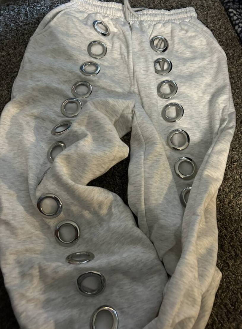 Laid-back sweats reimagined with bold chrome eyelets that turn casual comfort into a statement.