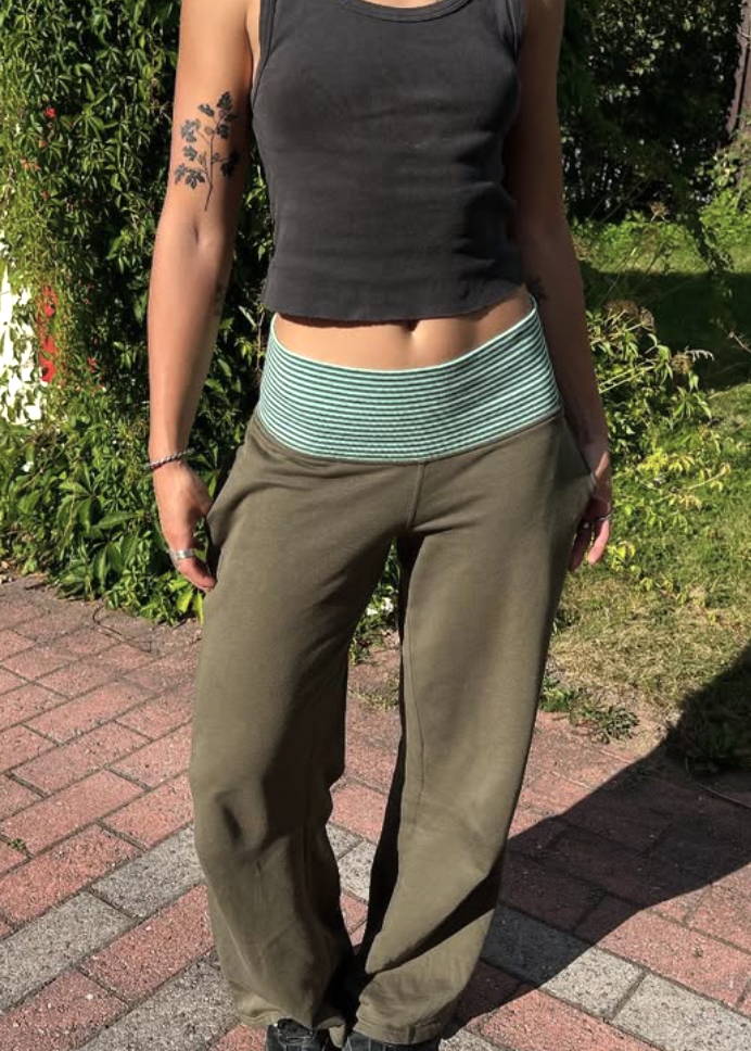 Relax in style with these wide-leg olive green pants, featuring a soft drape and a striped fold-over waistband for the perfect mix of comfort and modern edge.
