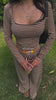 A matching long-sleeve crop top and wide-leg pant combo with a clean square neckline and soft ribbed stretch fabric. Designed for lounging or stepping out, it’s the perfect mix of comfort and minimal style.
